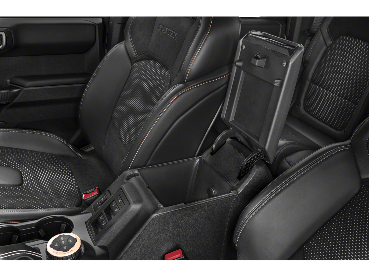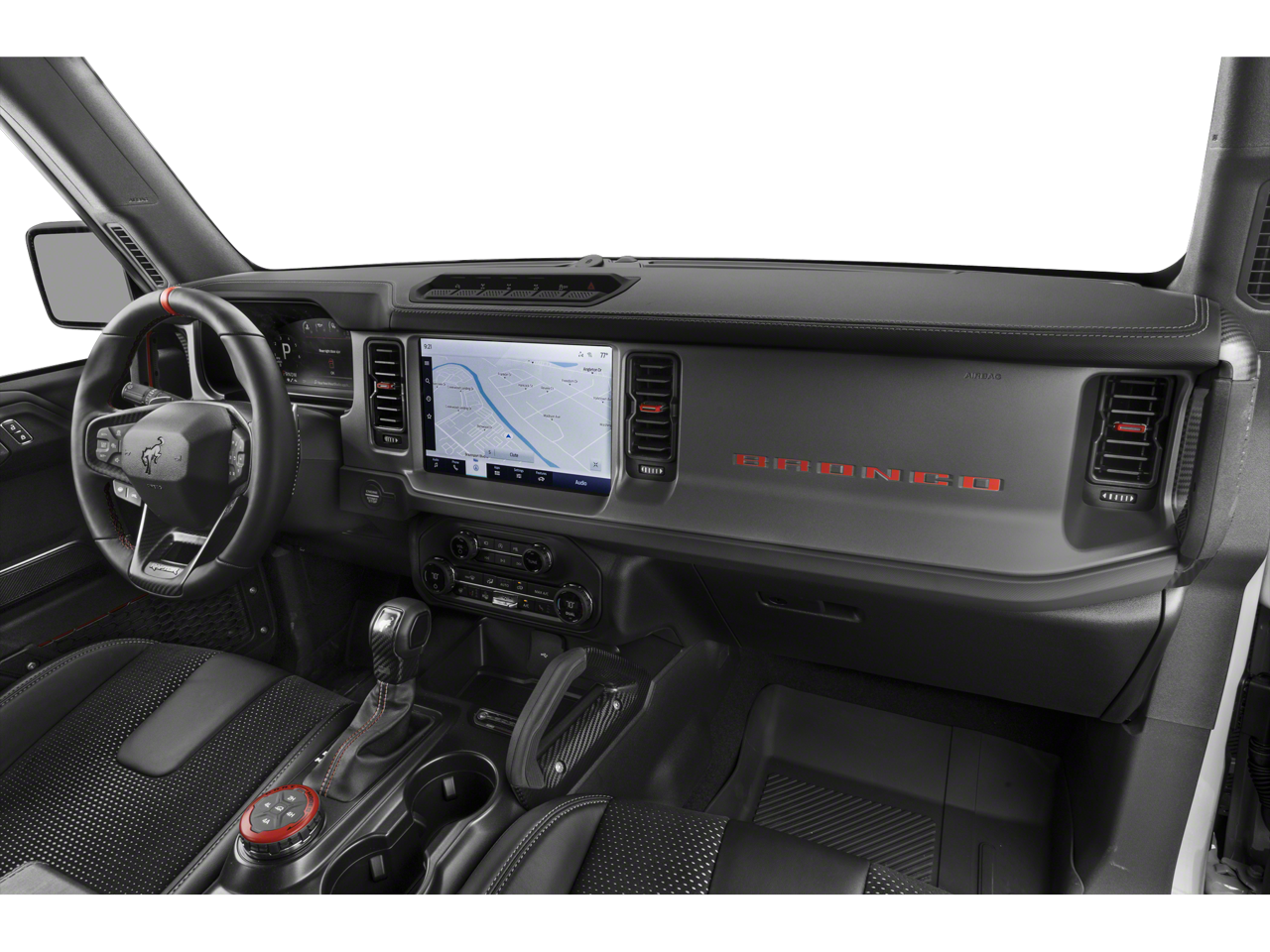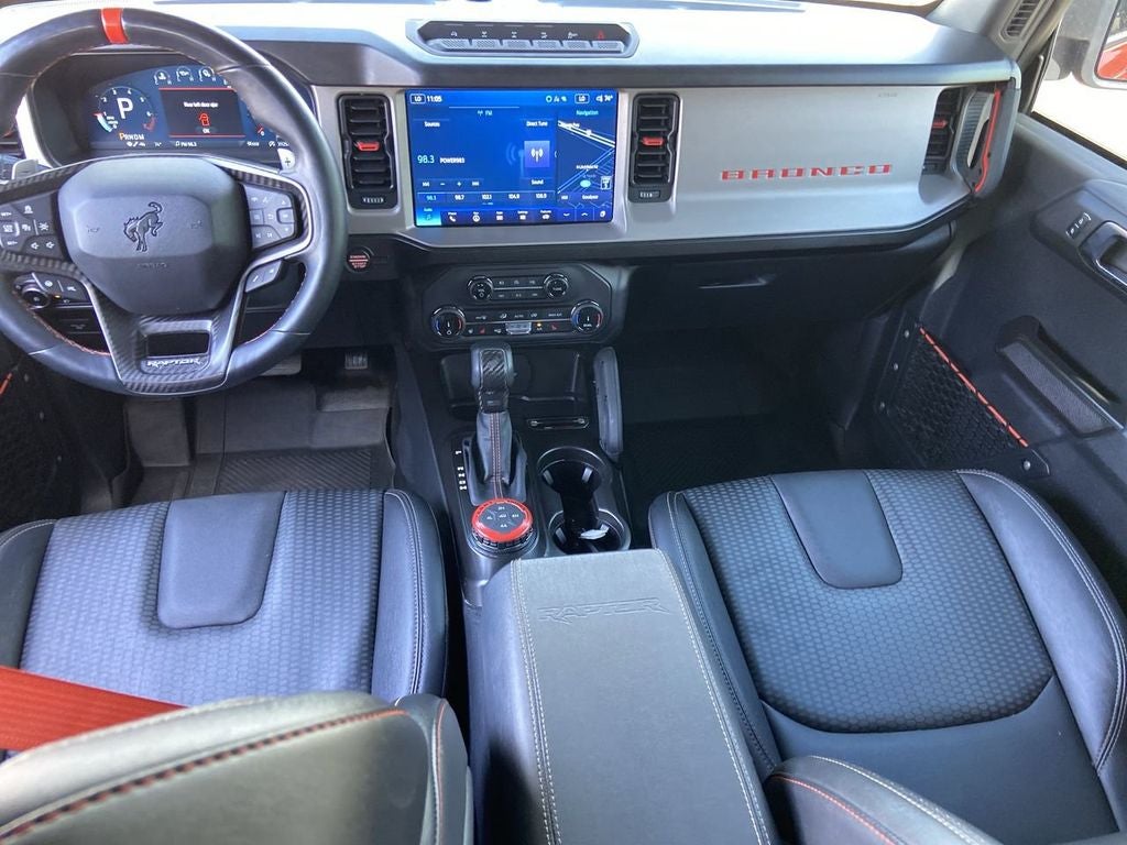 The Bronco Raptor's striking exterior is highlighted by the Hot Pepper Red Metallic Tinted Clearcoat, adding a bold and sophisticated touch to its rugged design. Step inside and you'll be greeted by a wealth of premium features, including: